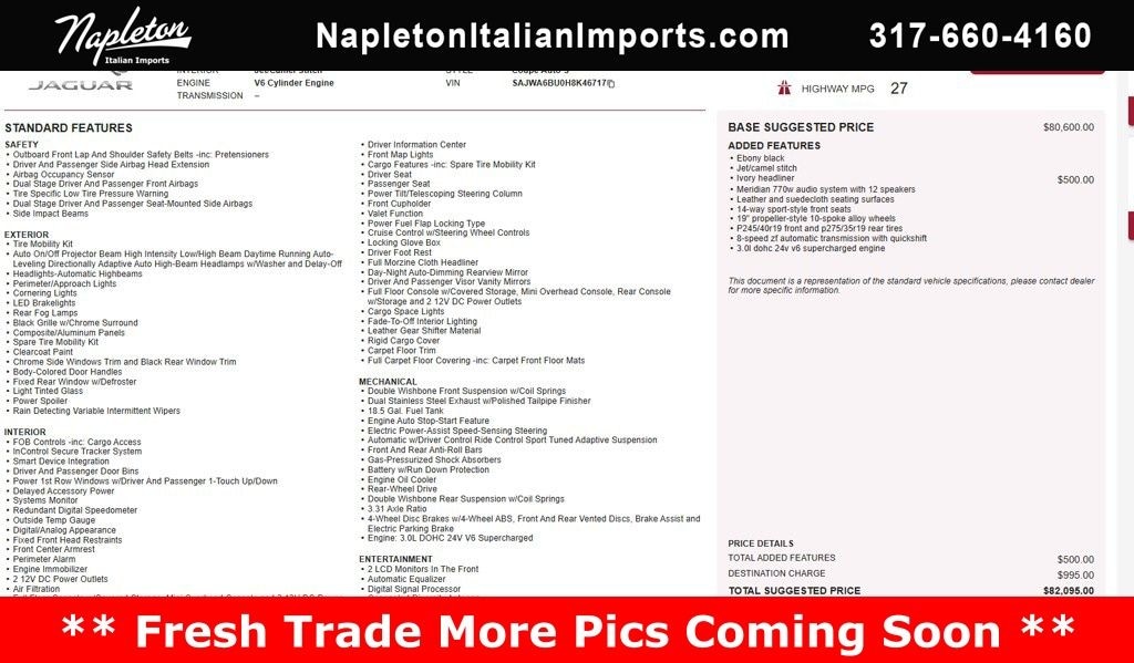 This F-TYPE is well equipped with 12 Speakers, 14-Way Sport-Style Front Seats, 4-Wheel Disc Brakes, ABS brakes, Adaptive suspension, Air Conditioning, Alloy wheels, AM/FM radio: SiriusXM, Auto High-beam Headlights, Auto tilt-away steering wheel, Auto-dimming Rear-View mirror, Automatic temperature control, Brake assist, Bumpers: body-color, Delay-off headlights, Driver door bin, Driver vanity mirror, Dual front impact airbags, Dual front side impact airbags, DVD-Audio, Electronic Stability Control, Emergency communication system: InControl Protect, Four wheel independent suspension, Front anti-roll bar, Front Bucket Seats, Front Center Armrest, Front reading lights, Fully automatic headlights, Headlight cleaning, Heated door mirrors, High intensity discharge headlights: Bi-xenon, Illuminated entry, Leather & Suedecloth Seating Surfaces, Leather Shift Knob, Low tire pressure warning, Memory seat, Navigation System, Occupant sensing airbag, Outside temperature display, Overhead console, Panic alarm, Passenger door bin, Passenger vanity mirror, Power door mirrors, Power driver seat, Power passenger seat, Power steering, Power windows, Premium Leather Seating Surfaces, Radio data system, Radio: Meridian 770W Audio System w/12 Speakers, Rain sensing wipers, Rear anti-roll bar, Rear fog lights, Rear window defroster, Remote CD player, Remote keyless entry, Security system, Speed control, Speed-sensing steering, Spoiler, Sport steering wheel, Steering wheel memory, Steering wheel mounted audio controls, Tachometer, Telescoping steering wheel, Tilt steering wheel, Traction control, Trip computer, Turn signal indicator mirrors, Variably intermittent wipers, and Wheels: 19" Propeller-Style 10-Spoke Alloy.