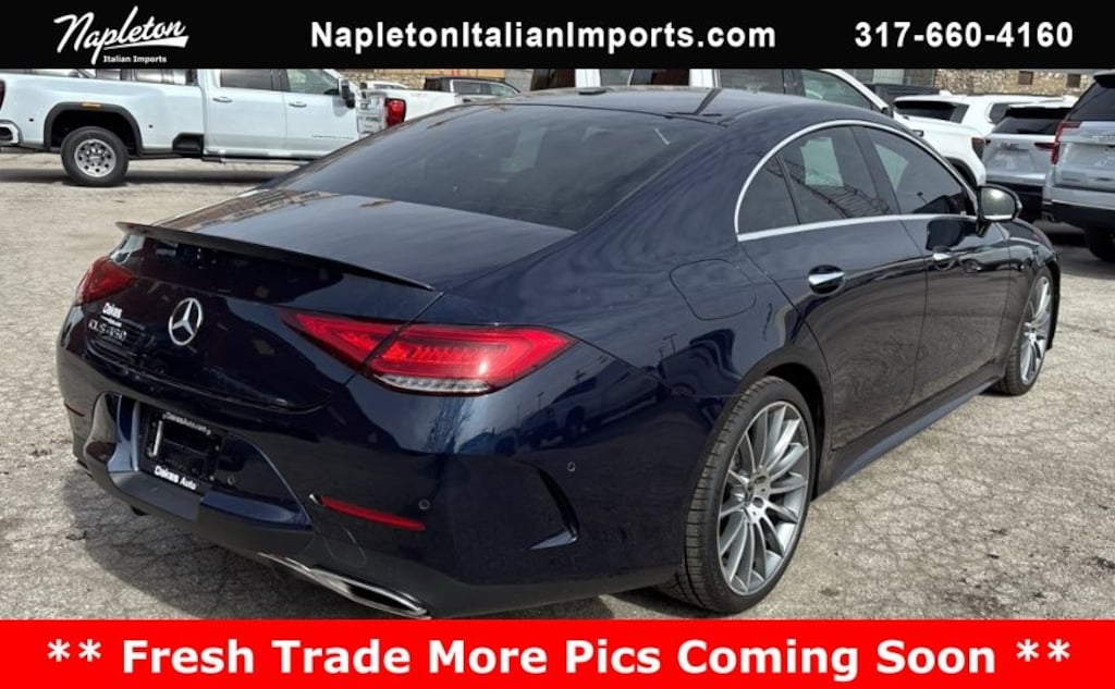 This CLS is well equipped with 13 Speakers, 3-Spoke Nappa Leather Multifunction Steering Wheel, 4-Wheel Disc Brakes, ABS brakes, Air Conditioning, Alloy wheels, AM/FM radio, Apple CarPlay®/Android Auto®, Auto tilt-away steering wheel, Auto-dimming door mirrors, Auto-dimming Rear-View mirror, Automatic temperature control, Brake assist, Bumpers: body-color, Center Console in Brown Ash Wood, Child-Seat-Sensing Airbag, Compass, Delay-off headlights, Driver door bin, Driver vanity mirror, Dual front impact airbags, Dual front side impact airbags, Electronic Stability Control, Emergency communication system: eCall Emergency System, Exterior Parking Camera Rear, Four wheel independent suspension, Front anti-roll bar, Front Bucket Seats, Front Center Armrest, Front dual zone A/C, Front reading lights, Fully automatic headlights, Garage door transmitter: HomeLink, Genuine wood console insert, Genuine wood dashboard insert, Genuine wood door panel insert, Heated door mirrors, Heated front seats, Heated Power Front Bucket Seats, Illuminated entry, Knee airbag, Leather Upholstery, Low tire pressure warning, Memory seat, Navigation system: MBUX, Occupant sensing airbag, Outside temperature display, Overhead airbag, Overhead console, Panic alarm, Passenger door bin, Passenger vanity mirror, Power door mirrors, Power driver seat, Power moonroof, Power passenger seat, Power steering, Power windows, Radio data system, Radio: MBUX Infotainment System w/Navigation, Rain sensing wipers, Rear anti-roll bar, Rear reading lights, Rear seat center armrest, Rear window defroster, Remote keyless entry, Security system, Speed control, Speed-sensing steering, Speed-Sensitive Wipers, Split folding rear seat, Steering wheel memory, Steering wheel mounted audio controls, Tachometer, Telescoping steering wheel, Tilt steering wheel, Traction control, Trip computer, Turn signal indicator mirrors, Variably intermittent wipers, and Wheels: 19" Twin Multi-Spoke.